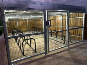 Two Greasby Bike Shelters With Semi-Vertical Bike Racks For 24 Bike Spaces. Complete With Single Access Gates & Digital Combination Locks.