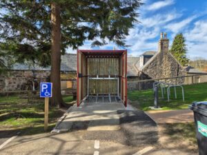 Trinity Timber Two Tier Bike Shelter With Sheffield Cycle Stands at Camphill Rudolf School Aberdeen.