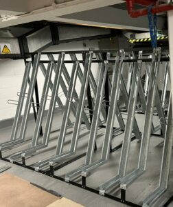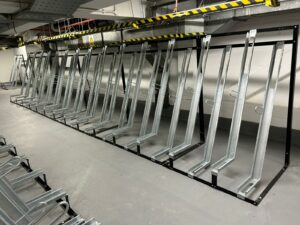 Semi-vertical bike racks were chosen to maximise the use of the space which whilst also fitting within the restricted floor to ceiling height.