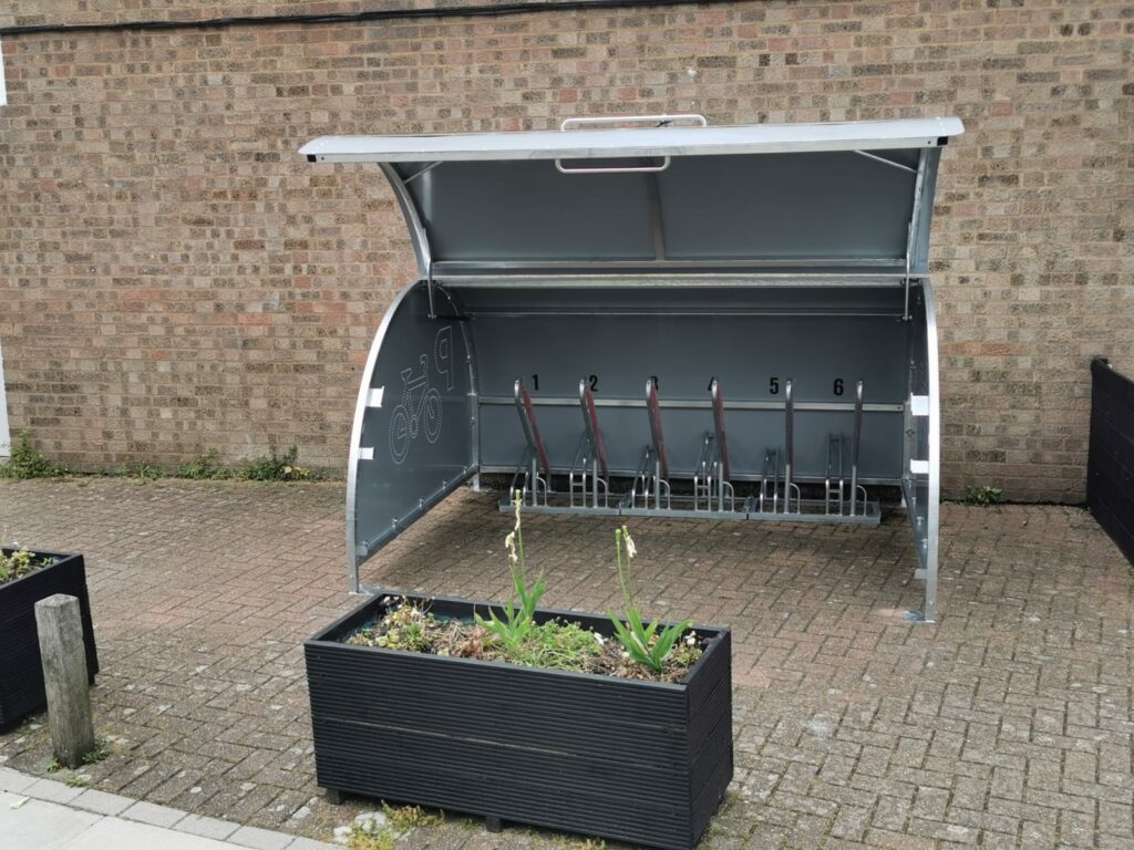 7 Merton Mesh Bike Shelters with Sheffield Bike Stands, equalling to 162 bike spaces.