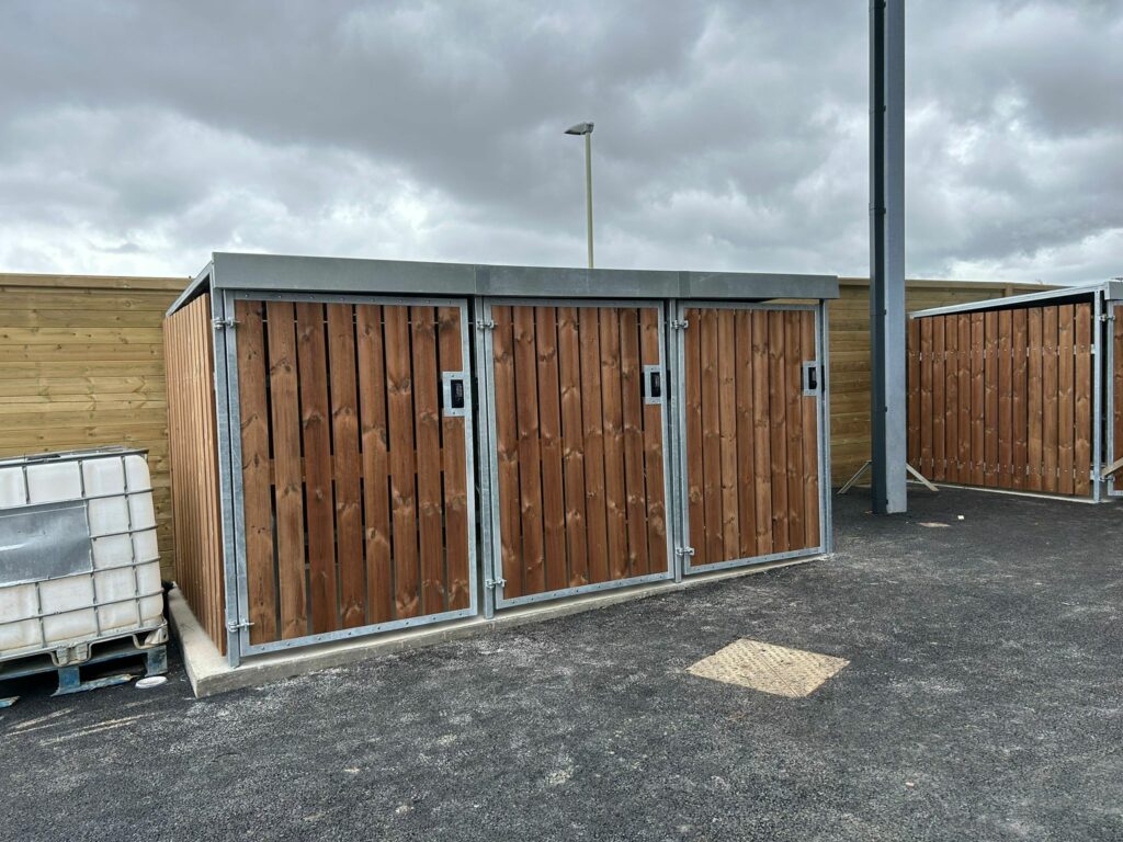 Each shelter was fitted with single swing gates, both finished with euro cylinder digital combination locking mechanisms to increase security for users. The roof was constructed using galvanised box profile steel sheets, complete with flashings to the front and sides, providing effective weather protection and a clean, professional appearance in line with our clients request.