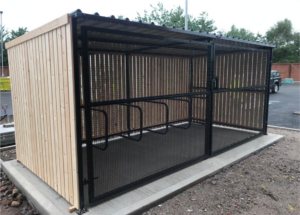 Our 10-space Trinity Timber Clad Cycle Shelter was the chosen product. Galvanised and powder coated frame finish with PAR-treated hit and miss timber cladding, with integrated cycle hoops as part of the shelter, securing the bikes.